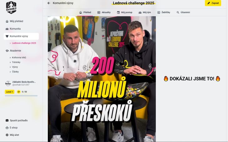 Učitelé ZŠ Nádražní se složili na charitativní příspěvek pro Donio a organizaci Srdce na pravém místě, čímž se nám otevřel přístup do Lednové Challenge 2025 kluků ze Švihej, kteří si vzali za cíl vybrat 5.000.000,- Kč pro děti, jež samy skákat nemohou a nemohou ani spoustu jiných věcí. Mrkněte TADY. Žáci naší školy nepřispívají finančně, ale „pouhými“ přeskoky švihadla třeba v tělesné výchově, doma u televize nebo někde s kamarády odpoledne v kroužku. Může skákat celá rodina, každý skok se počítá. Přeskoky se evidují a za každou překonanou metu zasílají za děti velké firmy finanční obnos na účet Donia. Prosím tedy, jste-li ochotni podpořit tuto věc, skákejte. Průběžně mi zasílejte počty přeskoků a dobu skákání na mail Tato e-mailová adresa je chráněna před spamboty. Pro její zobrazení musíte mít povolen Javascript. nebo ve zprávě na EduPage a já to budu psát do TÉTO sdílené tabulky, a hlavně do Švihej portálu. Klidně i pod přezdívkou😉.